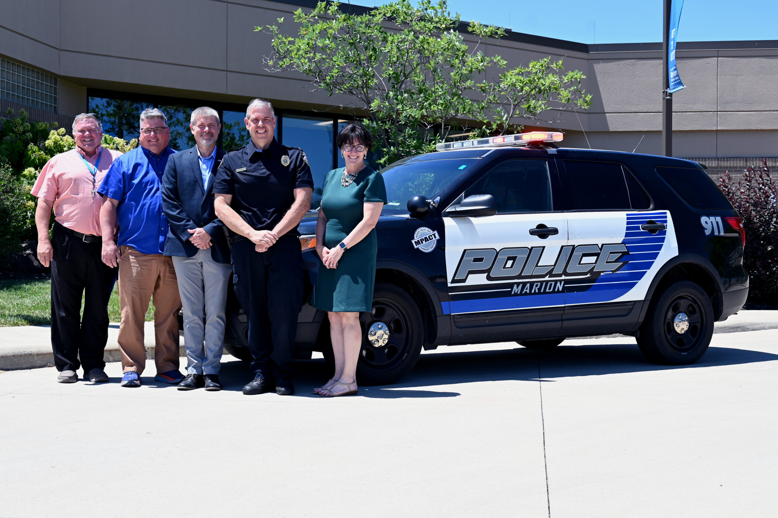 4 college representative and the police chief pose in front an SUV in front of the college.